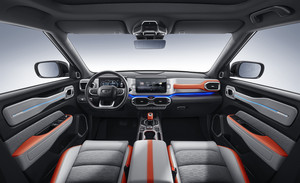 从目前官方所给出的图片来看,吉利ICON炽爱版的内饰采用了与外观色调基本一致的灰橙相点缀的设计方式,在副驾驶前拉手、门把手、档把、座椅边缘处都加入了珊瑚橙元素,中控台边缘则使用蓝色元素进行点缀。新车内部大面积采用深灰混纺面料与浅灰PVC材质的拼接材料。值得一提的是,吉利ICON获得了五星级汽车内饰材料生态产品认证,内饰环保度达到婴儿级,不仅给乘客提供了更加豪华的视觉效果,还增加了乘车的安全舒适度。