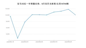 2020年10月,宝马X3销量为11981辆,同比增长31.4%,环比下降18.74%。1-10月份,宝马X3销量为111488辆,同比增长31.69%。在最近1年中,宝马X3销量在2020年09月达到最高,销量为14744辆。
