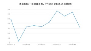 2020年10月,奥迪Q8销量为314辆,同比下降19.9%,环比下降50.86%。1-10月份,奥迪Q8销量为4168辆,同比增长707.75%。在最近1年中,奥迪Q8销量在2020年07月达到最高,销量为666辆。