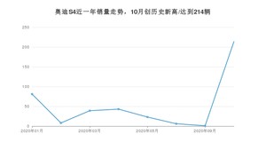 2020年10月,奥迪S4销量为214辆,同比增长63.36%,环比增长21%。1-10月份,奥迪S4销量为415辆,同比下降82.98%。在最近1年中,奥迪S4销量在2020年10月达到最高,销量为214辆。