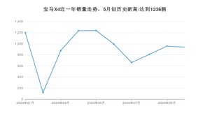 2020年10月,宝马X4销量为937辆,同比下降11.77%,环比下降1.99%。1-10月份,宝马X4销量为9015辆,同比增长8.25%。在最近1年中,宝马X4销量在2020年05月达到最高,销量为1236辆。