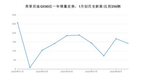2020年10月,英菲尼迪QX60销量为141辆,同比下降48.16%,环比下降16.07%。1-10月份,英菲尼迪QX60销量为1408辆,同比下降38.52%。在最近1年中,英菲尼迪QX60销量在2020年01月达到最高,销量为256辆。