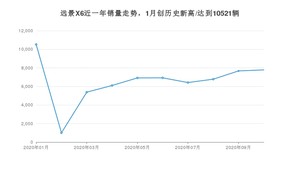 2020年10月,远景X6销量为7781辆,同比增长10.01%,环比增长1.45%。1-10月份,远景X6销量为65494辆,同比增长33.6%。在最近1年中,远景X6销量在2020年01月达到最高,销量为10521辆。