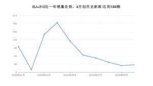 2020年10月,BJ 212销量为28辆,同比下降73.58%,环比增长12%。1-10月份,BJ 212销量为752辆,同比下降24.72%。在最近1年中,BJ 212销量在2020年04月达到最高,销量为184辆。