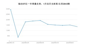 2020年10月,逸动DT销量为1341辆,同比下降49.79%,环比下降11.02%。1-10月份,逸动DT销量为16303辆,同比下降30.66%。在最近1年中,逸动DT销量在2020年01月达到最高,销量为2943辆。
