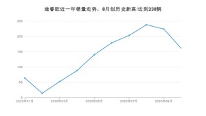 2020年10月,途睿欧销量为161辆,同比增长82.95%,环比下降28.13%。1-10月份,途睿欧销量为1363辆,同比下降5.41%。在最近1年中,途睿欧销量在2020年08月达到最高,销量为238辆。