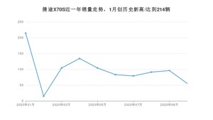 2020年10月,捷途X70S销量为55辆,同比下降83.13%,环比下降42.71%。1-10月份,捷途X70S销量为975辆,同比下降85.97%。在最近1年中,捷途X70S销量在2020年01月达到最高,销量为214辆。