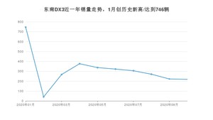 2020年10月,东南DX3销量为218辆,同比下降79.61%,环比下降1.8%。1-10月份,东南DX3销量为3104辆,同比下降72.7%。在最近1年中,东南DX3销量在2020年01月达到最高,销量为746辆。