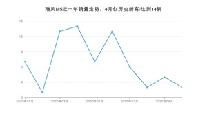 2020年10月,瑞风M5销量为2辆,同比下降92.59%,环比下降50%。1-10月份,瑞风M5销量为69辆,同比下降92.68%。在最近1年中,瑞风M5销量在2020年04月达到最高,销量为14辆。