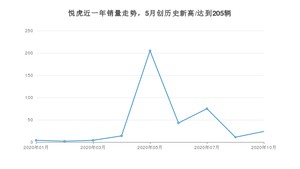 2020年10月,悦虎销量为24辆,同比增长33.33%,环比增长118.18%。1-10月份,悦虎销量为382辆,同比增长1%。在最近1年中,悦虎销量在2020年05月达到最高,销量为205辆。