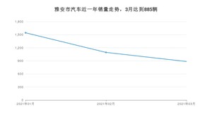 2021年3月,雅安市汽车总销量为885辆,同比增长23.78%,环比下降19.1%。1-3月份,雅安市总销量为3523辆,同比增长45.1%。在最近1年中,雅安市销量在2021年01月达到最高,销量为1544辆。