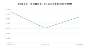 2021年3月,宝马5系销量为16191辆,同比增长70.32%,环比增长75.74%。1-3月份,宝马5系销量为44774辆,同比增长72.4%。在最近1年中,宝马5系销量在2021年01月达到最高,销量为19370辆。