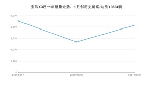 2021年3月,宝马X3销量为12458辆,同比增长43.01%,环比增长54.82%。1-3月份,宝马X3销量为34039辆,同比增长61.07%。在最近1年中,宝马X3销量在2021年01月达到最高,销量为13534辆。