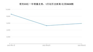 2021年3月,领克03销量为5924辆,同比增长33.36%,环比增长12.11%。1-3月份,领克03销量为19816辆,同比增长61.37%。在最近1年中,领克03销量在2021年01月达到最高,销量为8608辆。