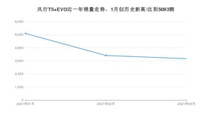 2021年3月,风行T5 EVO销量为3168辆,环比下降7.12%。1-3月份,风行T5 EVO销量为11672辆,在最近1年中,风行T5 EVO销量在2021年01月达到最高,销量为5093辆。