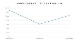 2021年3月,Macan销量为2606辆,同比下降9.42%,环比增长67.8%。1-3月份,Macan销量为7370辆,同比下降1.11%。在最近1年中,Macan销量在2021年01月达到最高,销量为3211辆。
