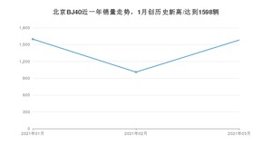 2021年3月,北京BJ40销量为1582辆,同比增长90.37%,环比增长56.63%。1-3月份,北京BJ40销量为4190辆,同比增长89.76%。在最近1年中,北京BJ40销量在2021年01月达到最高,销量为1598辆。