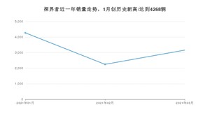 2021年3月,探界者销量为3156辆,同比增长51.29%,环比增长40.7%。1-3月份,探界者销量为9667辆,同比增长62.94%。在最近1年中,探界者销量在2021年01月达到最高,销量为4268辆。