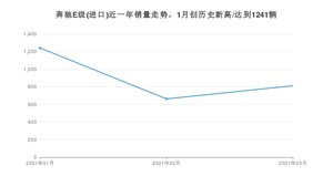 2021年3月,奔驰E级(进口)销量为812辆,同比增长32.68%,环比增长22.47%。1-3月份,奔驰E级(进口)销量为2716辆,同比增长134.14%。在最近1年中,奔驰E级(进口)销量在2021年01月达到最高,销量为1241辆。