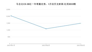 2021年3月,马自达CX-30销量为1496辆,环比增长37.25%。1-3月份,马自达CX-30销量为4619辆,在最近1年中,马自达CX-30销量在2021年01月达到最高,销量为2033辆。