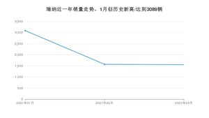 2021年3月,瑞纳销量为1555辆,同比下降43.78%,环比下降1.08%。1-3月份,瑞纳销量为6216辆,同比下降2.34%。在最近1年中,瑞纳销量在2021年01月达到最高,销量为3089辆。