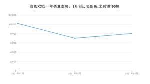 2021年3月,远景X3销量为8048辆,同比增长22.87%,环比增长14.51%。1-3月份,远景X3销量为25271辆,同比增长33.12%。在最近1年中,远景X3销量在2021年01月达到最高,销量为10195辆。