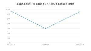 2021年3月,小鹏汽车G3销量为1955辆,同比增长78.7%,环比增长119.42%。1-3月份,小鹏汽车G3销量为4834辆,同比增长107.38%。在最近1年中,小鹏汽车G3销量在2021年01月达到最高,销量为1988辆。