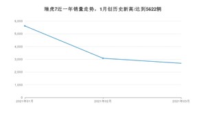 2021年3月,瑞虎7销量为2690辆,同比增长154.25%,环比下降12.75%。1-3月份,瑞虎7销量为11395辆,同比增长488.89%。在最近1年中,瑞虎7销量在2021年01月达到最高,销量为5622辆。