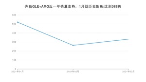 2021年3月,奔驰GLE AMG销量为331辆,同比增长81.87%,环比增长26.34%。1-3月份,奔驰GLE AMG销量为1112辆,同比增长250.79%。在最近1年中,奔驰GLE AMG销量在2021年01月达到最高,销量为519辆。