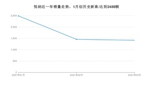 2021年3月,悦纳销量为1414辆,同比下降22.52%,环比下降2.82%。1-3月份,悦纳销量为5357辆,同比下降20.5%。在最近1年中,悦纳销量在2021年01月达到最高,销量为2488辆。