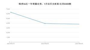 2021年3月,瑞虎5x销量为3804辆,同比增长71.12%,环比下降3.26%。1-3月份,瑞虎5x销量为14058辆,同比增长70.19%。在最近1年中,瑞虎5x销量在2021年01月达到最高,销量为6322辆。