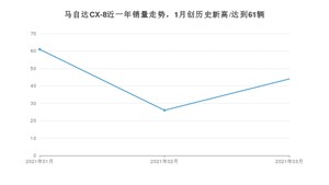2021年3月,马自达CX-8销量为44辆,同比下降18.52%,环比增长69.23%。1-3月份,马自达CX-8销量为131辆,同比下降4.38%。在最近1年中,马自达CX-8销量在2021年01月达到最高,销量为61辆。
