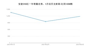 2021年3月,宝骏310销量为1184辆,同比下降8.57%,环比增长24.37%。1-3月份,宝骏310销量为3494辆,同比增长17.29%。在最近1年中,宝骏310销量在2021年01月达到最高,销量为1358辆。
