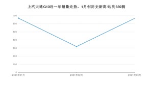 2021年3月,上汽大通G10销量为666辆,同比增长67.76%,环比增长109.43%。1-3月份,上汽大通G10销量为1653辆,同比增长30.47%。在最近1年中,上汽大通G10销量在2021年01月达到最高,销量为669辆。