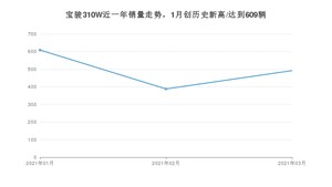 2021年3月,宝骏310W销量为492辆,同比下降65.23%,环比增长26.8%。1-3月份,宝骏310W销量为1489辆,同比下降60.07%。在最近1年中,宝骏310W销量在2021年01月达到最高,销量为609辆。