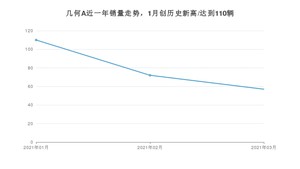 2021年3月,几何A销量为57辆,同比下降74.32%,环比下降20.83%。1-3月份,几何A销量为239辆,同比下降70.64%。在最近1年中,几何A销量在2021年01月达到最高,销量为110辆。