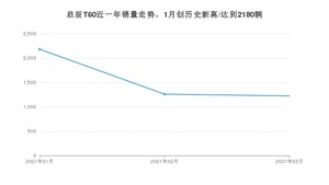 2021年3月,启辰T60销量为1223辆,同比增长26.6%,环比下降2.86%。1-3月份,启辰T60销量为4662辆,同比增长36.6%。在最近1年中,启辰T60销量在2021年01月达到最高,销量为2180辆。