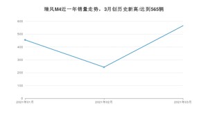 2021年3月,瑞风M4销量为565辆,同比增长20.73%,环比增长132.51%。1-3月份,瑞风M4销量为1263辆,同比增长7.95%。在最近1年中,瑞风M4销量在2021年03月达到最高,销量为565辆。