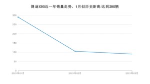 2021年3月,捷途X95销量为90辆,同比下降83.36%,环比下降14.29%。1-3月份,捷途X95销量为485辆,同比下降77.56%。在最近1年中,捷途X95销量在2021年01月达到最高,销量为290辆。