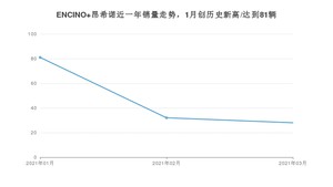 2021年3月,ENCINO 昂希诺销量为28辆,同比下降93.14%,环比下降12.5%。1-3月份,ENCINO 昂希诺销量为141辆,同比下降84%。在最近1年中,ENCINO 昂希诺销量在2021年01月达到最高,销量为81辆。