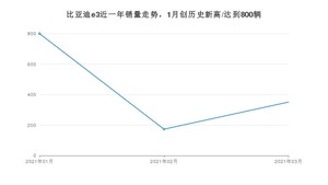 2021年3月,比亚迪e3销量为351辆,同比增长62.5%,环比增长102.89%。1-3月份,比亚迪e3销量为1324辆,同比增长153.15%。在最近1年中,比亚迪e3销量在2021年01月达到最高,销量为800辆。
