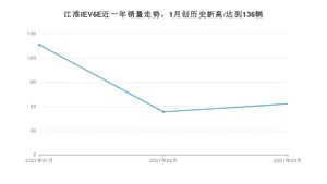2021年3月,江淮iEV6E销量为63辆,同比下降32.26%,环比增长18.87%。1-3月份,江淮iEV6E销量为252辆,同比增长30.57%。在最近1年中,江淮iEV6E销量在2021年01月达到最高,销量为136辆。