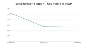 2021年3月,SWM斯威G05销量为266辆,同比下降35.9%,环比下降1.48%。1-3月份,SWM斯威G05销量为1056辆,同比下降35.41%。在最近1年中,SWM斯威G05销量在2021年01月达到最高,销量为520辆。