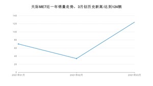 2021年3月,天际汽车品牌总体销量达到124辆,其中天际ME7销量达到124辆,占品牌总销量的100%。