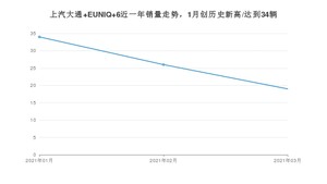 2021年3月,上汽大通 EUNIQ 6销量为19辆,环比下降26.92%。1-3月份,上汽大通 EUNIQ 6销量为79辆,在最近1年中,上汽大通 EUNIQ 6销量在2021年01月达到最高,销量为34辆。