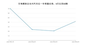 2021年4月,甘南藏族自治州汽车总销量为42辆,同比增长13.51%,环比增长100%。1-4月份,甘南藏族自治州总销量为157辆,同比下降5.99%。在最近1年中,甘南藏族自治州销量在2021年01月达到最高,销量为70辆。