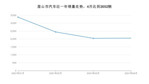 2021年4月,眉山市汽车总销量为2052辆,同比增长13%,环比增长0.49%。1-4月份,眉山市总销量为9919辆,同比增长43.59%。在最近1年中,眉山市销量在2021年01月达到最高,销量为3380辆。
