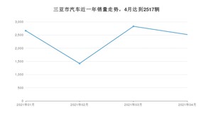2021年4月,三亚市汽车总销量为2517辆,同比增长88.82%,环比下降11.03%。1-4月份,三亚市总销量为9430辆,同比增长129.33%。在最近1年中,三亚市销量在2021年03月达到最高,销量为2829辆。