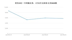 2021年4月,领克03销量为5735辆,同比增长1.88%,环比下降3.19%。1-4月份,领克03销量为25551辆,同比增长42.67%。在最近1年中,领克03销量在2021年01月达到最高,销量为8608辆。