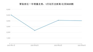 2021年4月,冒险家销量为4036辆,同比增长156.74%,环比下降1.51%。1-4月份,冒险家销量为15482辆,同比增长522.52%。在最近1年中,冒险家销量在2021年01月达到最高,销量为5025辆。